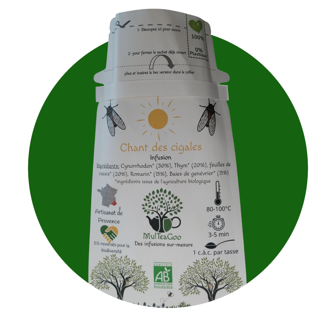 Imaginez-vous sous le soleil chaud de la Provence, bercé par le chant des cigales. Notre infusion bio « Chant des cigales » est bien plus qu’une simple boisson : c’est une invitation à un voyage sensoriel, où les arômes ensoleillés des plantes méditerranéennes se mêlent pour vous offrir un moment de pure détente et de bien-être.