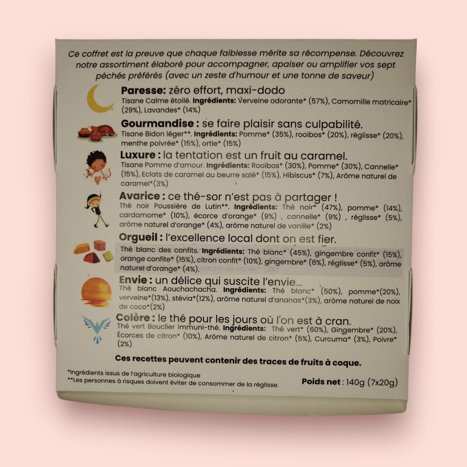 Ce coffret est la preuve que chaque faiblesse mérite sa récompense. Découvrez notre assortiment élaboré pour accompagner, apaiser ou amplifier vos sept péchés préférés 😈 (avec un zeste d’humour et une tonne de saveur).