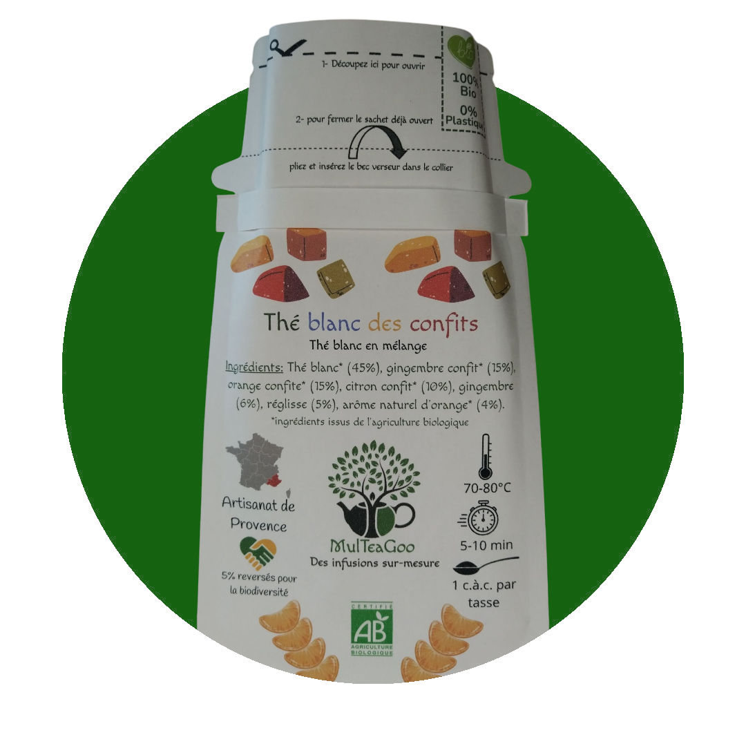 Ce mélange, qui est une déclinaison de notre création « Thé des confits » remplace le thé noir par du thé blanc pour des notes plus fruitées et florales. Le thé est plus léger et les saveurs des fruits confits sont sublimées ! 😁